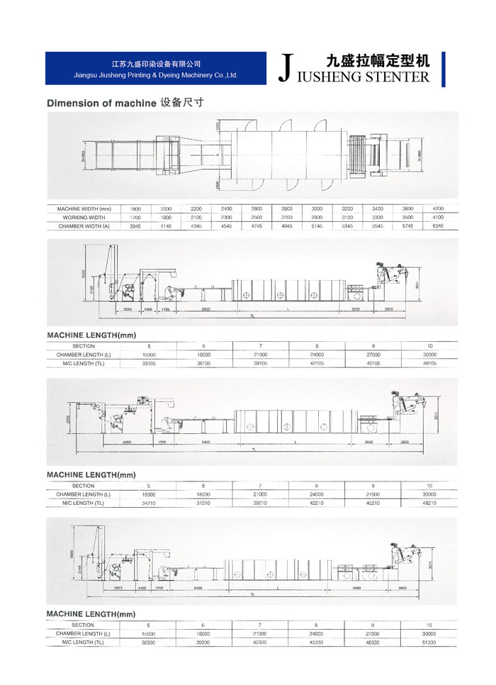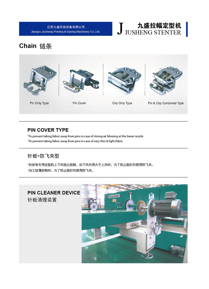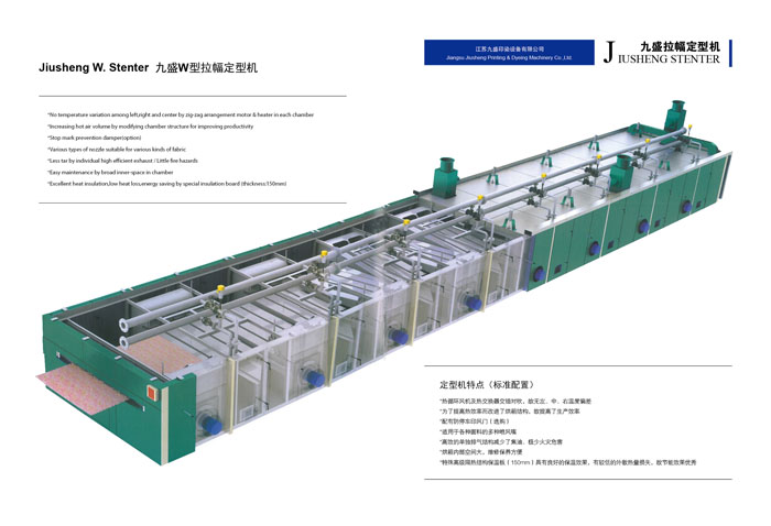 江蘇九盛印染設(shè)備有限公司(原江蘇鵬輝印染機(jī)械有限公司)創(chuàng)建于1986年,北長江,所在地區(qū)內(nèi)鐵路、高等級公路縱橫成網(wǎng),常州長江公路大橋飛架大江南北,水陸交通十分便利。公司有近二十年的熱定型機(jī)設(shè)計、生產(chǎn)經(jīng)驗、有批從事新型熱定機(jī)開發(fā)、設(shè)計的專業(yè)人才,具有豐富生產(chǎn)和制作經(jīng)驗的技師和技工。已成為國內(nèi)頗具名聲的機(jī)械制作企業(yè)。 樹脂定型是染整工程最后的程序,因此定型機(jī)的設(shè)計及操作技術(shù)成為決定織物品質(zhì)重要的一環(huán),九盛公司多年的經(jīng)驗改良完成新生代定型機(jī),針對業(yè)者需要對于節(jié)省人力布匹張力的減少、緯紗的調(diào)整,風(fēng)量的調(diào)節(jié),布邊控制及切邊損耗及至于熱能保持,維修工作,操作管理都有卓越表現(xiàn)及實際成果,而機(jī)械的研制及生產(chǎn)技術(shù)的發(fā)展是本公司創(chuàng)立的目標(biāo)和宗旨。