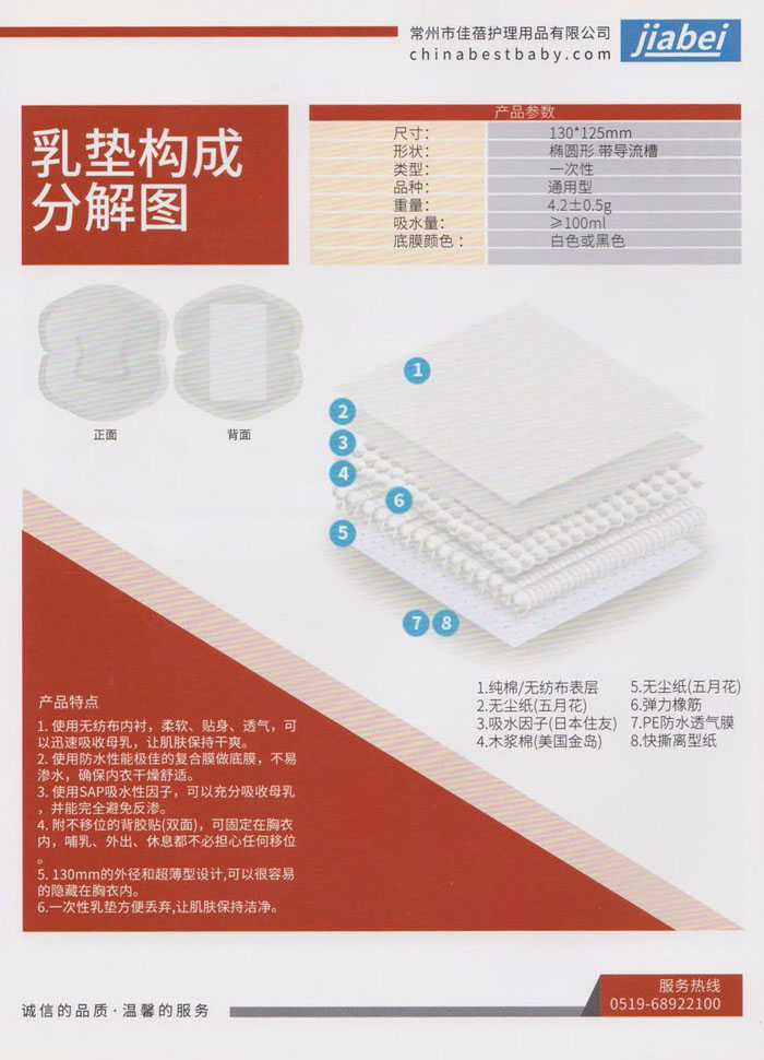 常州市佳蓓護理用品有限公司是一家專業(yè)從事開發(fā)、生產(chǎn)、銷售并具備自營出口的外向型企業(yè),主要生產(chǎn)“一次性防溢乳墊“,以質(zhì)量穩(wěn)定,柔軟親膚而深受客戶和消費者青睞。本公司產(chǎn)品從生產(chǎn)到包裝成品嚴(yán)格執(zhí)行無菌生產(chǎn)標(biāo)準(zhǔn)化流程,并和設(shè)備生產(chǎn)廠家合作開發(fā)了兩條從進料、生產(chǎn)、檢測、滅菌、成品包裝的無菌生產(chǎn)線,從而實現(xiàn)了真正意義上的無菌生產(chǎn)標(biāo)準(zhǔn)化。 佳蓓秉承”用戶至上“的原則,期待與國內(nèi)外客戶真誠合作,同時也誠邀品牌公司貼牌合作,歡迎您的蒞臨和指導(dǎo),與我們攜手合作,共創(chuàng)未來。