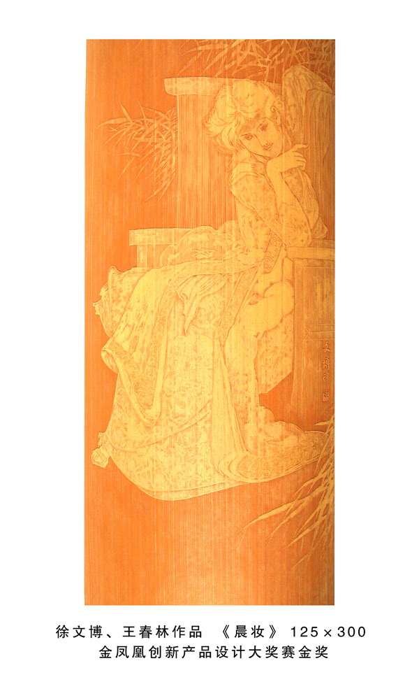 得獎情況 1、扇形擺件《花鳥》2004年9月太湖博覽會金獎 2、《蘭亭序》2008年11月江蘇藝博杯工藝美術(shù)精品獎銀獎 3、《雄風(fēng)圖》2008年11月江蘇藝博杯工藝美術(shù)精品獎創(chuàng)意獎 4、《靜音》2008年11月“天工藝苑•百花杯”中國工藝美術(shù)精品獎銀獎 5、《人物》2008年12月中國收藏藝術(shù)精品博覽會金獎 6、《花鳥》200 8年12月中國收藏藝術(shù)精品博覽會銀獎 7、《青竹鳥語》2008年12月中國收藏藝術(shù)品博覽會“入圍收藏品” 8、《吉祥富貴》2009年3月“金鳳凰”創(chuàng)新產(chǎn)品設(shè)計(jì)大獎賽金獎 9、《黃山云!2009年10月江蘇藝博杯工藝美術(shù)精品獎金獎 10、《花鳥》2009年10月第二屆江蘇旅游商品博覽會最佳產(chǎn)品獎 11、《秋菊圖》2009年11月“天工藝苑•百花杯”中國工藝美術(shù)精品獎銀獎 12、《秋鷹圖》2010年3月“金鳳凰”創(chuàng)新產(chǎn)品設(shè)計(jì)大獎賽優(yōu)秀獎 13、《花鳥四屏》2010年3月“金鳳凰”創(chuàng)新產(chǎn)品設(shè)計(jì)大獎賽銅獎 14、《荷塘清暑》2010年5月深圳國際文化產(chǎn)業(yè)博覽交易會銅獎 15、《溪山煙云圖》2010年9月江蘇藝博杯工藝美術(shù)精品大獎賽金獎 16、《高士臨風(fēng)圖》2010年10月“天工藝苑•百花杯”中國工藝美術(shù)精品獎銀獎 17、《溪山煙云圖》2010年11月第二屆東方工藝美術(shù)之都博覽會“迎春花獎” 18、《深山尋隱圖》2011年3月“金鳳凰”產(chǎn)品設(shè)計(jì)大獎賽銅獎 19、《欣欣向榮》2011年5月深圳國際文化產(chǎn)業(yè)博覽交易會金獎 20、《江崖遠(yuǎn)眺圖》2011年9月江蘇藝博杯工藝美術(shù)精品大獎賽金獎 21、《富春山居圖》2011年10月“天工藝苑•百花杯”中國工藝美術(shù)精品獎金獎 22、《深山訪友》2011年11月中國無錫國際文化藝術(shù)博覽會銀獎 23、《幽谷清音》2012年3月“金鳳凰”創(chuàng)新產(chǎn)品設(shè)計(jì)大獎賽銅獎 24、《群芳競艷》2012年10月“儒仕儒家、百花杯”中國工藝美術(shù)精品博覽會金獎 25、《山村渡口圖》2012年12江蘇藝博杯工藝美術(shù)精品大獎賽金獎。 26、《晨妝》2013年4月“金鳳凰”創(chuàng)新產(chǎn)品設(shè)計(jì)大獎賽金獎。 27、《和風(fēng)圖》2013年6月中國(青島)工藝美術(shù)博覽會創(chuàng)新產(chǎn)品設(shè)計(jì)大賽金獎。 28、《松壑聽泉》2013年9月江蘇藝博杯工藝美術(shù)精品大獎賽銀獎。 29、《君子圖》2013年11月“國信•百花杯”中國工藝美術(shù)精品獎銀獎 30《碧水輕舟》2014年5月深圳國際文化產(chǎn)業(yè)博覽交易會銀獎。 31、《千巖萬壑圖》2014年10月“中國原創(chuàng)•百花杯”中國工藝美術(shù)精品獎金獎 32、《溪山訪友圖》2014年10月江蘇藝博杯工藝美術(shù)精品大獎賽銀獎 33、《深山云壑》2014年12月深圳冬季國際文化產(chǎn)業(yè)博覽交易會金獎 34、《鷹》2015年深圳文化產(chǎn)業(yè)博覽交易會獲“中國工藝美術(shù)文化創(chuàng)意獎”金獎