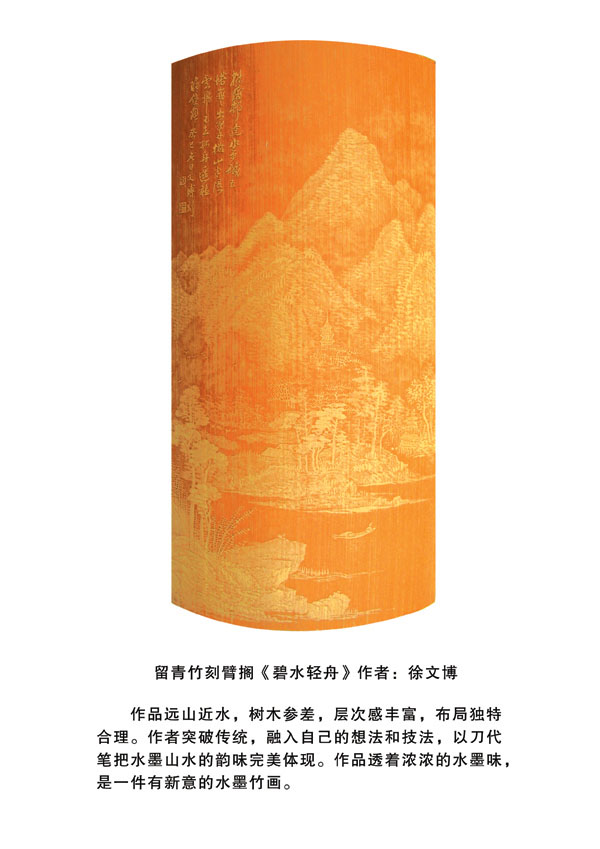 徐博(藝名文博),1973年生,江蘇武進(jìn)人,江蘇省省名人,高級工藝美術(shù)師,常州市留青竹刻非遺傳承人,常州工藝美術(shù)家協(xié)會理事,被譽(yù)為當(dāng)今中國最具創(chuàng)新意識的新銳竹刻家代表,多次獲得國家工藝美術(shù)大獎?釔哿羟嘀窨痰男煳牟┵p竹為樂,以竹詠志,借竹抒懷,悉心探索留青竹刻的藝術(shù)表現(xiàn)。在中國工藝美術(shù)大師蕭劍波的精心指導(dǎo)下,開創(chuàng)留青水墨山水之技法,更好的體現(xiàn)了竹刻淡雅清秀的藝術(shù)風(fēng)格,并不斷汲取書畫、攝影、雕塑等藝術(shù)精華,不斷滋養(yǎng)藝術(shù)情趣,提升擴(kuò)展胸襟人格的同時也逐步形成了其形神兼?zhèn),虛?shí)相生,氣韻生動的藝術(shù)特點(diǎn),作品為眾多的國內(nèi)外收藏家珍藏。