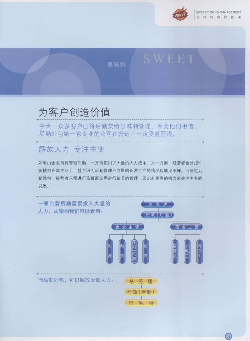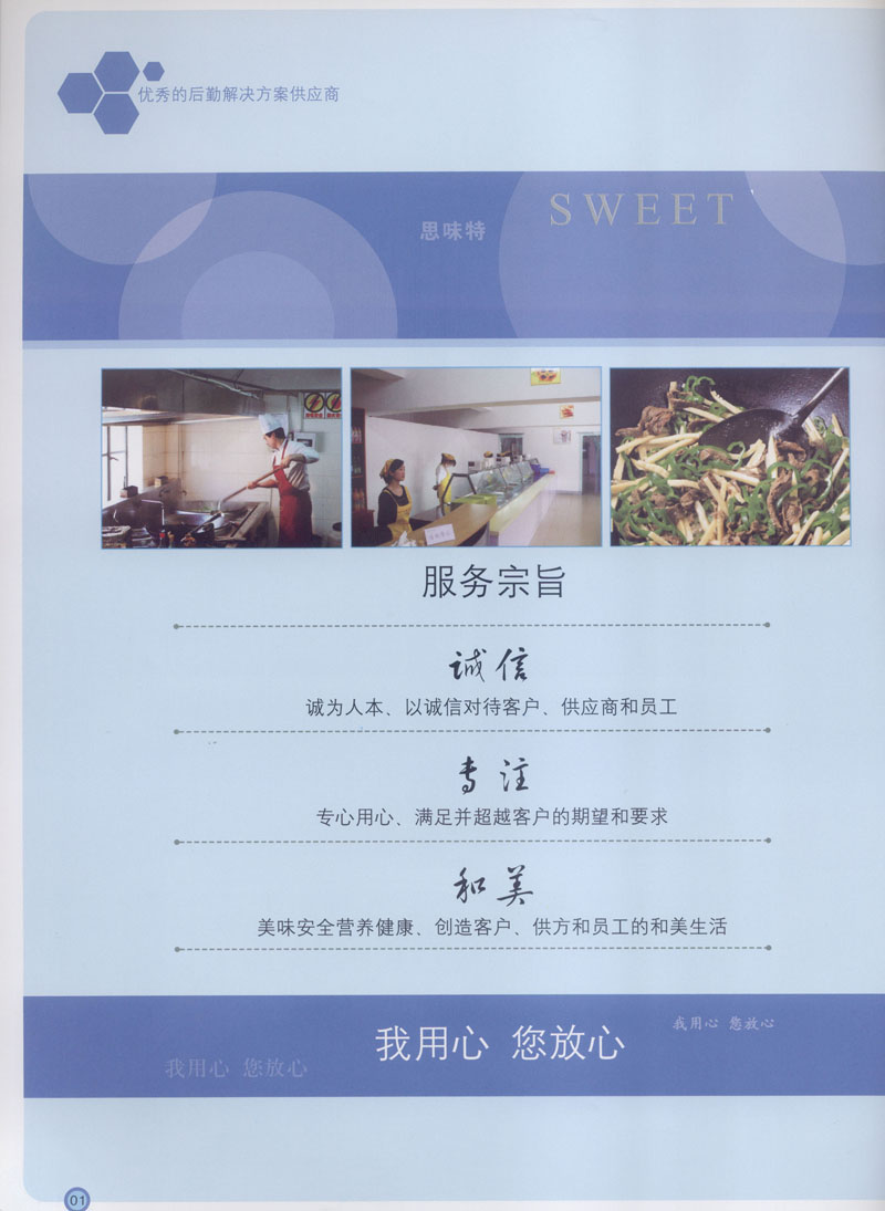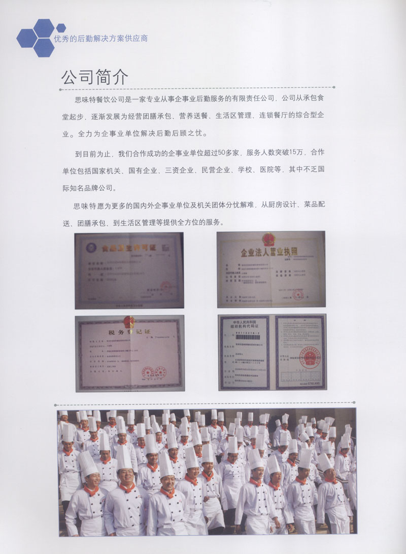 常州市思味特餐飲有限公司是一家專業(yè)從事企事業(yè)后勤服務(wù)的有限責(zé)任公司,公司從承包食堂起步,逐漸發(fā)展為經(jīng)營團(tuán)膳承包、營養(yǎng)送餐、生活區(qū)管理、連鎖餐廳的綜合型企業(yè)。2008年公司斥資100萬元,在常州興建了可以同時提供3000餐膳食的中央廚房,重點(diǎn)打造“和美客”后勤服務(wù)品牌,全力為企事業(yè)單位解決后勤后顧之憂。 到目前為止,我們合作成功的企事業(yè)單位超過50多家,服務(wù)人數(shù)突破15萬,合作單位包括國家機(jī)關(guān)、國有企業(yè)、三資企業(yè)、民營企業(yè)、學(xué)校、醫(yī)院等,其中不乏國際知名品牌公司。 和美客愿為更多的國內(nèi)外企事業(yè)單位及機(jī)關(guān)團(tuán)體分憂解難,從廚房設(shè)計、菜品配送、團(tuán)膳承包、到生活區(qū)管理等提供全方位的服務(wù)。