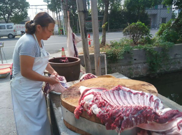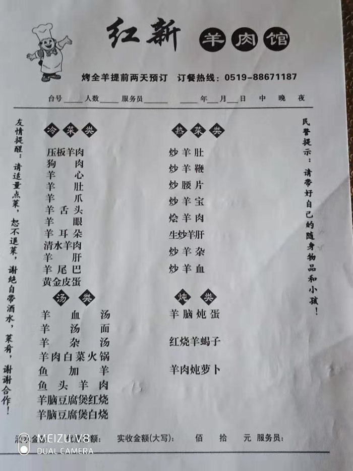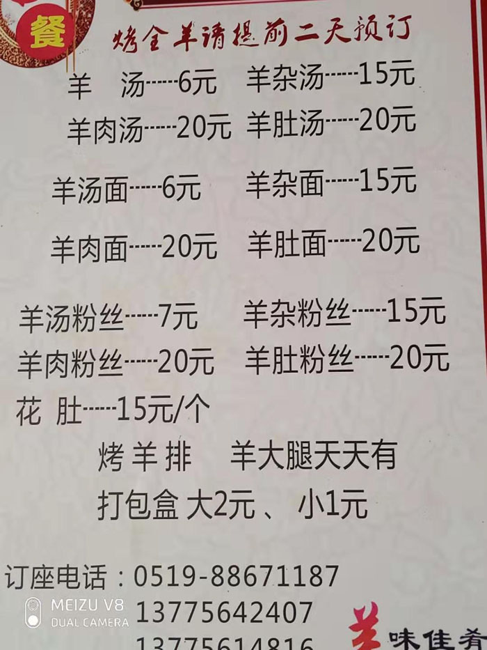 武進(jìn)區(qū)鄭陸寧河全羊館從事羊肉經(jīng)營(yíng)四十年,羊館經(jīng)營(yíng)面積300平方米,從羊頭到羊蹄都能做菜:羊頭、羊排、羊拐、羊蹄、羊耳,其他還有羊羔,烤羊,羊湯面,清水羊肉,全羊宴。羊肉湯只是白煮,湯白而濃稠,肉爛味鮮,還不腥不油不膩。你若細(xì)看菜單就能發(fā)現(xiàn),全羊席幾乎都是拿燉湯帶出來(lái)的,這更加顯示出羊肉湯的魅力。