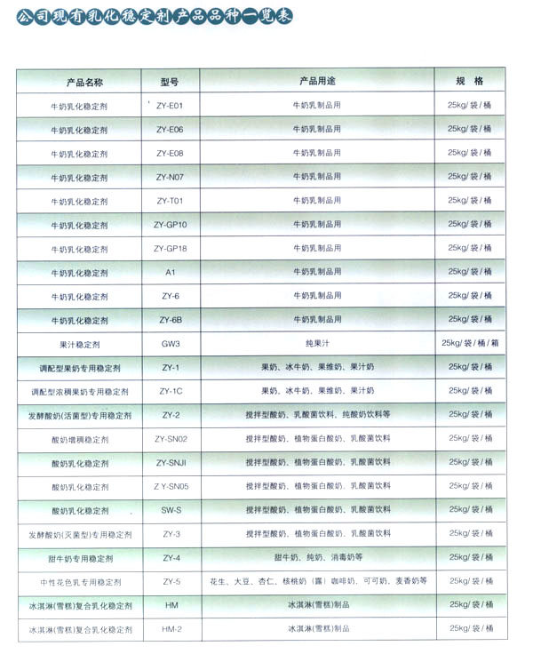 常州市中友食品有限公司;匚挥诔V菔袞|郊開發(fā)區(qū),廠房占地面積6000平方米,擁有全新的生產(chǎn)線,先進(jìn)的生產(chǎn)流程和嚴(yán)格的質(zhì)量管理體系(工廠已通過IS09001:2000質(zhì)量管理體系的認(rèn)證)。并有專業(yè)的技術(shù)開發(fā)和理化檢驗(yàn)的設(shè)施、經(jīng)驗(yàn)豐富的技術(shù)人員。公司以科技為依托,常年與高等院校合作,不斷地開發(fā)和研制適合市場需求的食品添加劑系列產(chǎn)品。公司每年面向全國招收優(yōu)秀的博士、碩士及優(yōu)秀的大學(xué)生。公司現(xiàn)有員工1 00多人,管理人員2 0名、高工5名、產(chǎn)品專業(yè)技術(shù)開發(fā)人員12名,還有選擇地引進(jìn)和代理國內(nèi)外各種適用的食品添加劑。 依靠本公司雄厚的科技力量和先進(jìn)的科技設(shè)備,生產(chǎn)基地已經(jīng)具備了與客戶共同開發(fā)國內(nèi)外先進(jìn)食品添加劑的應(yīng)用技術(shù)。博適中友公司多年來致力于食品添加劑的研究和開發(fā),突破常規(guī)理念,以市場、用戶為中心,研究開發(fā)各個品種、各個檔次的食品添加劑,品種齊全又多樣,既有出口型又有內(nèi)銷型。公司主要穩(wěn)定劑產(chǎn)品有:乳飲料乳化穩(wěn)定劑、乳酸飲料乳化穩(wěn)定劑、冰淇淋(雪糕)復(fù)合乳化穩(wěn)定劑、果汁飲料乳化穩(wěn)定劑等,產(chǎn)品暢銷國內(nèi)外,覆蓋了全國二十多個省市,并建立了穩(wěn)定的銷售網(wǎng)絡(luò)。 本公司對產(chǎn)品指定了嚴(yán)格的質(zhì)量標(biāo)準(zhǔn),并報請常州市技術(shù)檢驗(yàn)監(jiān)督局審核批準(zhǔn),其技術(shù)要求完全符合GB一2760(食品添加劑使用衛(wèi)生標(biāo)準(zhǔn))和符合聯(lián)合國直接衛(wèi)生組織(WHO)、聯(lián)合國食品與農(nóng)業(yè)組織(FAO)以及美國食品和藥物管理局的有關(guān)規(guī)定。 長期以來,博適中友公司以市場定位為基本依據(jù),堅持發(fā)展并開辟多元化的國內(nèi)外市場:以專業(yè)化、長遠(yuǎn)化、規(guī);癁榻(jīng)營思路:以開拓創(chuàng)新,務(wù)實(shí)誠信為經(jīng)營理念,不斷促進(jìn)企業(yè)發(fā)展壯大。 公司自創(chuàng)建以來,始終不渝地堅持質(zhì)量第一、信譽(yù)至上,以精湛的工藝加工產(chǎn)品,不管是標(biāo)準(zhǔn)的或特制的都可享有本公司優(yōu)良的技術(shù)服務(wù)。無論您需要何種功能性添加劑,博適中友食品添加劑公司均能滿足您的要求。博適中友公司以價格合理、服務(wù)周到為經(jīng)營宗旨,努力引導(dǎo)食品添加劑應(yīng)用發(fā)展的新潮流、新方向。在才能卓越的領(lǐng)導(dǎo)者的帶領(lǐng)下,全體員工以開拓、創(chuàng)新、求實(shí)、守信為企業(yè)精神,不斷地提高自身的素質(zhì)。 公司的宗旨是“開拓創(chuàng)新發(fā)展、精誠服務(wù)和諧”為目標(biāo),熱忱與各界有識之士攜手共進(jìn),共創(chuàng)輝煌!如今公司業(yè)務(wù)蒸蒸日上,專業(yè)技術(shù)研究越走越精,這都與廣大客戶大力支持分不開。在新世紀(jì)來臨之際,上海博適中友公司愿與您真誠合作,攜手并進(jìn),共鑄新的輝煌!