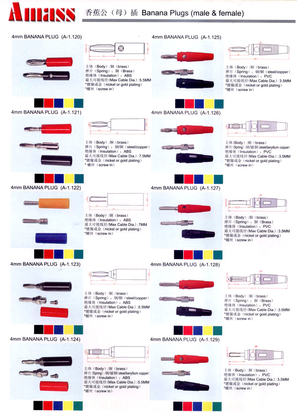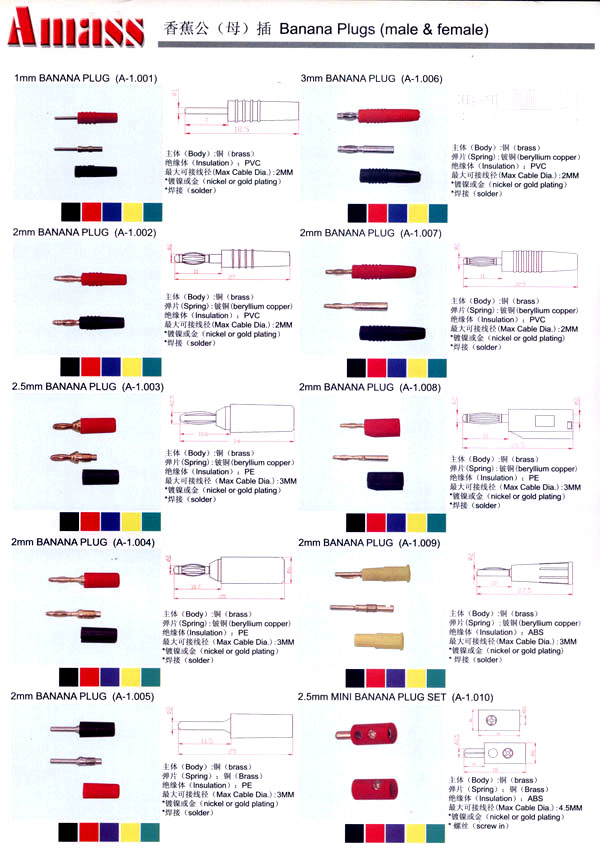 本公司專業(yè)生產(chǎn)各類香蕉插頭,香蕉插座,接線柱,電瓶夾,鱷魚夾,測試導(dǎo)線,測試筆等。產(chǎn)品分2mm/2.5mm/3mm/3.5mm/4mm五大系列,百余種款式, 各種香蕉插廣泛用于儀器、儀表、電力測試、教學(xué)、玩具,視聽設(shè)備、醫(yī)療儀器,保健產(chǎn)品等領(lǐng)域。公司技術(shù)力量雄厚,生產(chǎn)工藝先進(jìn),產(chǎn)品遠(yuǎn)銷港、臺(tái)、歐美,并與飛利浦等國際品牌配套。公司本著精益求精的理念,歡迎新老客戶光臨。