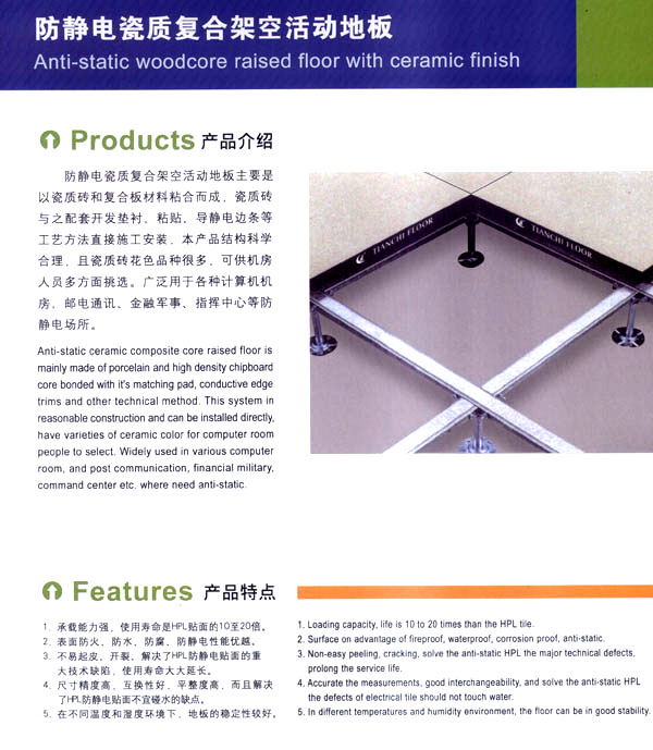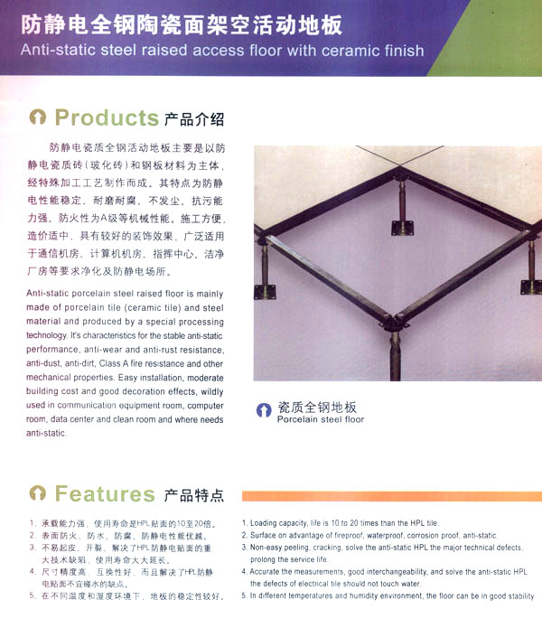 公司專業(yè)生產(chǎn)“天馳”系列活動地板,符合國家安全要求,種類完備多樣,其中防靜電瓷質高架通路地板除具有普通瓷質的裝飾和實用性外,其耐磨,防水,防火功能優(yōu)于其他同類產(chǎn)品,深受客戶歡迎。