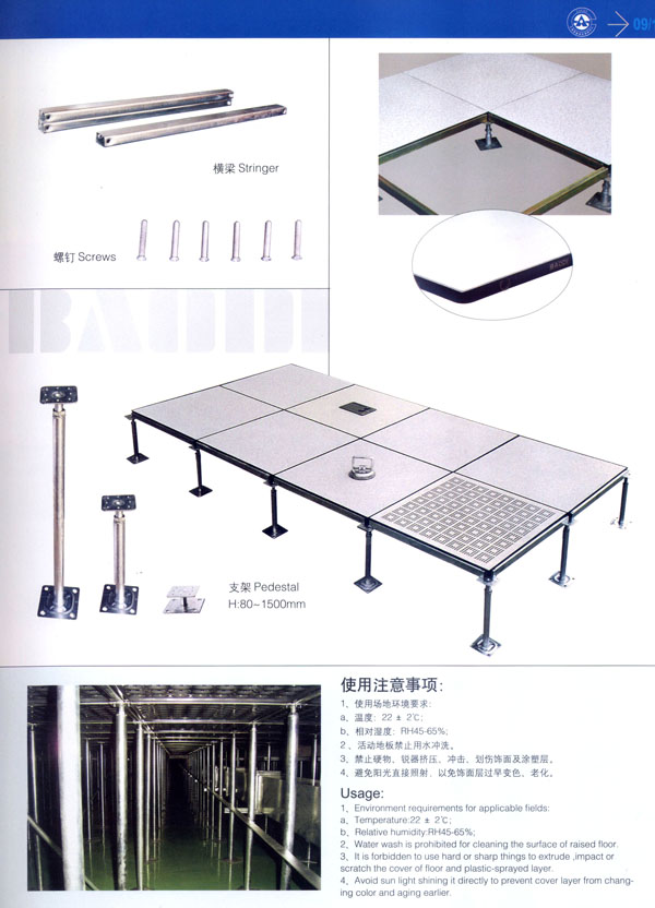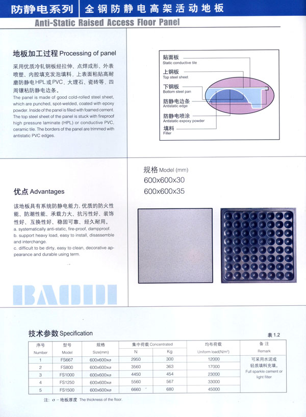 常州市寶進防靜電設備有限公司是各類防靜電產(chǎn)品開發(fā)、設計、制造、安裝服務于一體的企業(yè)。以上海物理學會空間靜電專業(yè)委員會強大的技術力量為后盾。公司主要致力于各類機房、電氣室設計、安裝;各類防靜電干擾處理及用戶特種需求。公司擁有防空間靜電干擾—聲學復合系統(tǒng)、輕質(zhì)全鋼活動地板、高環(huán)保型抗靜電貼面等多項發(fā)明專利,是國內(nèi)該行業(yè)中唯一擁有自主知識產(chǎn)權的企業(yè)。 公司主要產(chǎn)品“寶迪”牌 防靜電高架地板及板材、OA網(wǎng)絡地板。產(chǎn)品廣泛用于電子廠房、金融系統(tǒng)、電力、廣電、軍隊及智能化樓宇。并向多個國家出口。 針對發(fā)泡水泥填充的全鋼高架地板自身重、承載差的缺點,我們開發(fā)了輕質(zhì)全鋼高架地板。在提前地板承載的同時,大幅減輕了地板的自重。 公司一貫嚴格執(zhí)行ISO9001-2000質(zhì)量保證體系,為用戶提供高品質(zhì)的產(chǎn)品及完善的售后服務是公司一貫的宗旨。