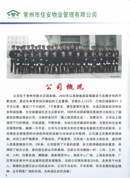 佳安物業(yè)管理有限公司位于常州市新北區(qū)薛家鎮(zhèn),2005年由薛家鎮(zhèn)黨委政府注冊成立,注冊資金50萬元,屬于三級資質(zhì)企業(yè)。成立之初,佳安物業(yè)作為政屬事業(yè)單位,主要負(fù)責(zé)管理薛家鎮(zhèn)順園新村安置小區(qū)。隨著薛家鎮(zhèn)經(jīng)濟(jì)和人口的發(fā)展,為主動適應(yīng)經(jīng)濟(jì)發(fā)展新常態(tài),全面深化物業(yè)綜合改革,打造具有薛家特色的物業(yè)公司,佳安物業(yè)由政府下屬的事業(yè)單位正式轉(zhuǎn)變?yōu)楠毩⑦\營的企業(yè),并增資到1000萬元。 2017年6月,公司通過審核被評為“AAA”級信用企業(yè),同月,公司實施ISO9001質(zhì)量管理體系標(biāo)準(zhǔn),并于8月通過質(zhì)量體系認(rèn)證審核。2018年8月,公司通過了ISO14001環(huán)境管理體系、ohsas18001職業(yè)健康安全管理體系的認(rèn)證審核。 目前,公司主要承接小區(qū)物業(yè)服務(wù)及廠區(qū)外派保安服務(wù)、保潔服務(wù)等,F(xiàn)公司為薛家鎮(zhèn)順園一村至順園九村安置小區(qū)及奧林匹克花園、怡景名園2處商業(yè)小區(qū)提供物業(yè)服務(wù);為江南農(nóng)村商業(yè)銀行新北區(qū)所有支行、中車鐵馬、投資服務(wù)中心、華夏藝博園、薛家幼兒園、薛家小學(xué)及薛家中學(xué)等單位提供外派保安服務(wù);為薛家鎮(zhèn)中心廣場及松林別墅提供保安服務(wù);為華夏藝博園及投資服務(wù)中心提供保潔服務(wù)等。 在這十余年中,佳安物業(yè)與時俱進(jìn),銳意進(jìn)取,為地方建設(shè)發(fā)展注入動力,為居民和企業(yè)安全保駕護(hù)航,尤其是在實踐中,我們積極探索,正逐步摸索出一條適合薛家城鄉(xiāng)一體化建設(shè)的社區(qū)物業(yè)管理的新路。希望通過今天的分享,和大家一起探討我們在“管辦分離”等方面的實踐經(jīng)驗,并在此基礎(chǔ)上為薛家的可持續(xù)發(fā)展提供可借鑒、推廣的新型物業(yè)管理之路。