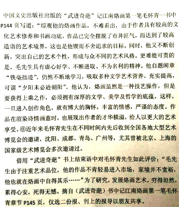 毛懷青,江蘇常州市武進(jìn)人。 中國工藝美術(shù)學(xué)會會員,常州市中國烙畫研究會副會長,常州市文博鑒賞協(xié)會理事,非物質(zhì)文化遺產(chǎn)烙畫傳承人。高級工藝美術(shù)師。 年輕時學(xué)習(xí)國畫、油畫中年蔓現(xiàn)掌州咯畫源遠(yuǎn)流長、歷史悠久,有著其它美術(shù)門類不具備的藝術(shù)風(fēng)格與特色?芍^是工藝美術(shù)中的一朵十分亮麗的藝術(shù)奇葩,是我民族先人給我們留下的一份不可多得十分珍貴的一份文化遺產(chǎn)。為弘揚與發(fā)展這份優(yōu)秀文化遺產(chǎn),我從此下定決心研究烙畫,愿付出一份力量為振興烙畫事業(yè)做出貢獻(xiàn)。至今已潛心研究幾十年,取得了可喜的成績,被業(yè)界公認(rèn),社會關(guān)注與認(rèn)可。有“江南烙畫第一筆”之美譽。 近年來,創(chuàng)作的烙畫作品分別獲得過全國、省市級的金、銀、銅獎多次。中央電視臺曾兩次播放過本人的烙畫作品,江蘇電視臺、常州電視臺也曾多次播放過本人的作品與烙畫藝術(shù)生涯,揚子晚報、常州日報、常州晚報也曾多次報導(dǎo)過本人的烙畫作品,出版物有三種版本都能查閱到介紹本的烙畫從藝生涯與藝術(shù)業(yè)績。