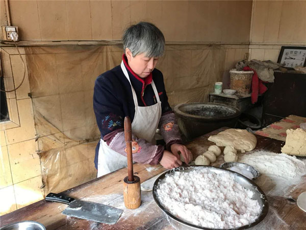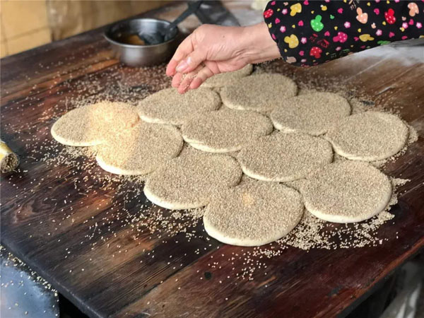 每天凌晨一兩點(diǎn)鐘,沈國(guó)平就要去采買當(dāng)天最新鮮的豬板油,回來(lái)清理干凈,和上面粉攪拌均勻,制成面團(tuán)。麻糕的制作主要由沈國(guó)平妻子和兩個(gè)姊妹來(lái)完成。揉面、搓胚子、配油酥,按餡心、搟均勻,整個(gè)過(guò)程行云流水,連貫無(wú)比。