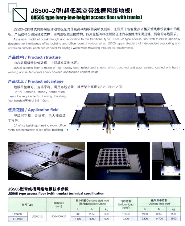 公司生產(chǎn)防靜電鋼質(zhì)、木質(zhì)機房地板和強化復(fù)合地板及各種電腦操作臺系列產(chǎn)品。該產(chǎn)品廣泛應(yīng)用于電子機房、通訊機房、各類實驗室和管線鋪設(shè)集中的防靜電場所以及家庭、大型商場的裝飾。公司技術(shù)力量雄厚、管理科學,已具有設(shè)計、開發(fā)、市場營銷及售后服務(wù)的專業(yè)人才隊伍。