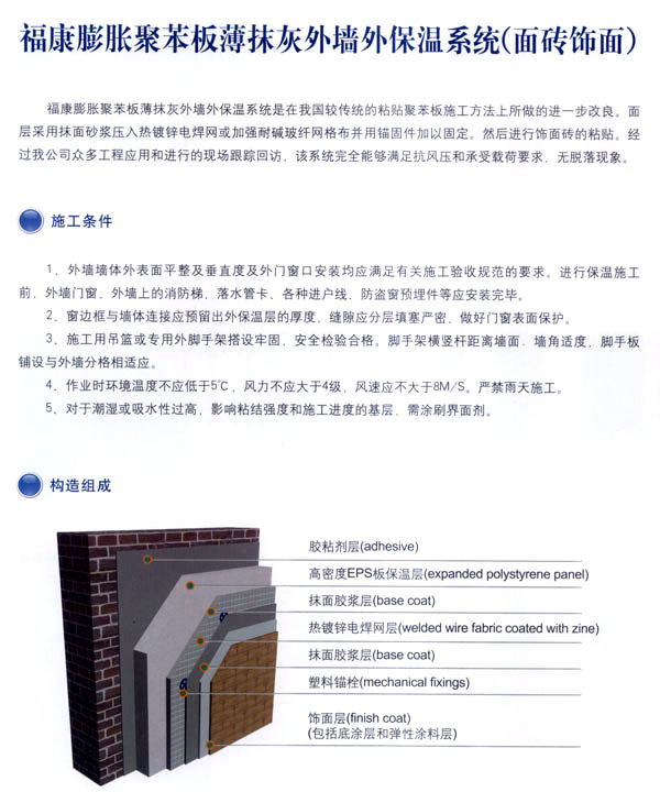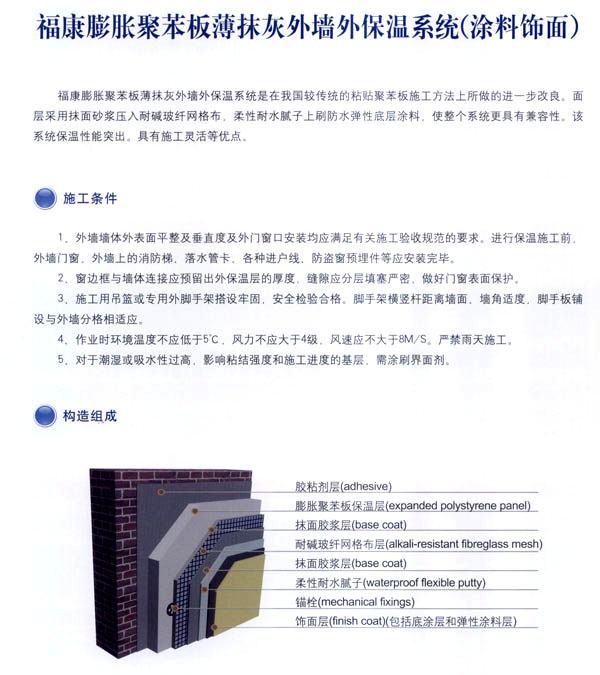 常州市?敌滦徒ú挠邢薰臼且匝兄崎_發(fā)、生產(chǎn)、銷售、施工、技術(shù)服務(wù)為一體的化學建筑材料的專業(yè)企業(yè),通過與歐洲著 名建筑材料公司和國內(nèi)權(quán)威科研機構(gòu)合作,并聘請國家級專家為技術(shù)顧問,開發(fā)出適合我國市場的?礒PS、XPS及聚苯顆粒外墻外保溫節(jié)能系統(tǒng)。 公司的生產(chǎn)線全部采用國內(nèi)先進的電腦控制自動化設(shè)備,配備了專業(yè)的實驗中心,并且采用進口的可再分散乳膠粉為基料,確保福康外墻外保溫節(jié)能系統(tǒng)具有性能優(yōu)異、安全可靠,綠色環(huán)保、適用性強的高品質(zhì)特點。 公司開發(fā)的\'福康外墻外保溫系統(tǒng)\'被列為江蘇省科技成果推廣項目。整個生產(chǎn)流程依照質(zhì)量體系的要求,實行嚴格的監(jiān)控和檢測,為生產(chǎn)優(yōu)質(zhì)產(chǎn)品提供保證。高品質(zhì)的福康外墻外保溫系統(tǒng),提供從熱工設(shè)計、產(chǎn)品開發(fā)、生產(chǎn)銷售及工程施工全程服務(wù)的一體化解決方案。 公司本著“綠色環(huán)保、節(jié)約能源、造福人類”的理念。用我們一流的產(chǎn)品和優(yōu)秀的服務(wù),打造出一個個節(jié)能康居示范工程,為人類營造出舒適健康的居住環(huán)境。我們愿為中國節(jié)能事業(yè)的發(fā)展積極努力,更上一層樓。 公司組建高效的生產(chǎn)經(jīng)營管理模式,設(shè)立專業(yè)技術(shù)服務(wù)機構(gòu)。配備售后的優(yōu)質(zhì)服務(wù)。實行原材料、運輸、安裝一條龍服務(wù)。經(jīng)本公司施工之后,貴公司可以直接批涂料、裝門窗、貼瓷磚,保證絕無任何質(zhì)量問題。