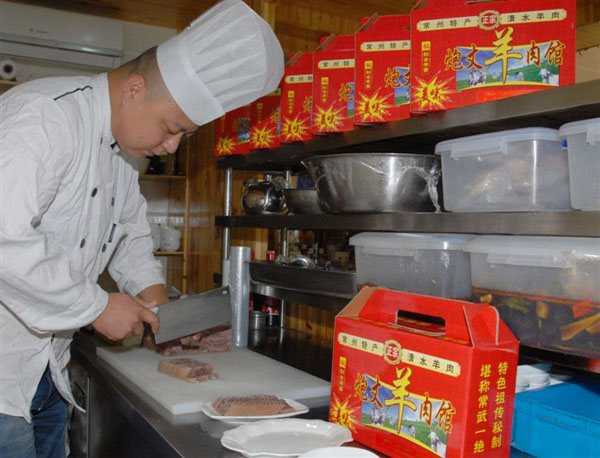 談家的羊肉館位于鄭陸老街上,深秋的一天,記者來到這家羊肉館,穿過大堂走到廚房里,幾名工人正在忙著處理羊肉。余菊華穿著大紅色的薄毛衣,坐在桌子旁,正在麻利地剔著羊肉上的肥油。她是羊肉館的老一代老板娘,如今和老伴談仲興一起,仍天天來店里幫著兒子談旭東打下手。余阿姨隨手拿過一塊長(zhǎng)方形的肉皮,用一把小刮刀撳在上面,輕輕地刮著,一團(tuán)團(tuán)白白的油被剔了下來,堆在一邊!拔壹业难蛉馀酶蓛舻,腿上的肥肉還有筋筋拉拉的東西,全都要弄掉,就是自己家買了豬肉燒紅燒肉,也不可能弄到這么干凈的,F(xiàn)在的客人都怕胖,所以一定要處理得干干凈凈!庇喟⒁陶f。剔好的肉皮是用來熬成皮凍然后混和著羊肉壓制成羊糕的,只有清理得干凈,沒有一點(diǎn)雜質(zhì),羊糕的質(zhì)量才會(huì)好。