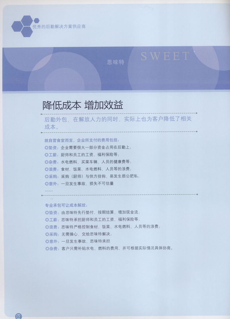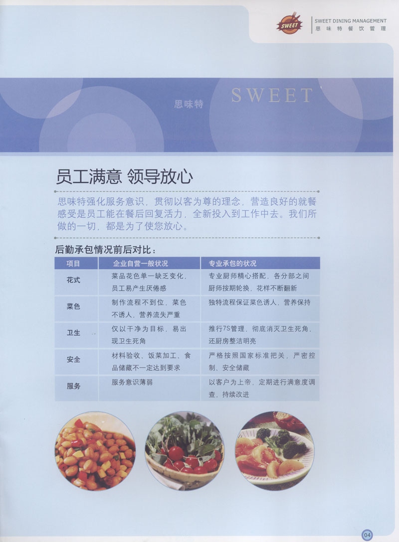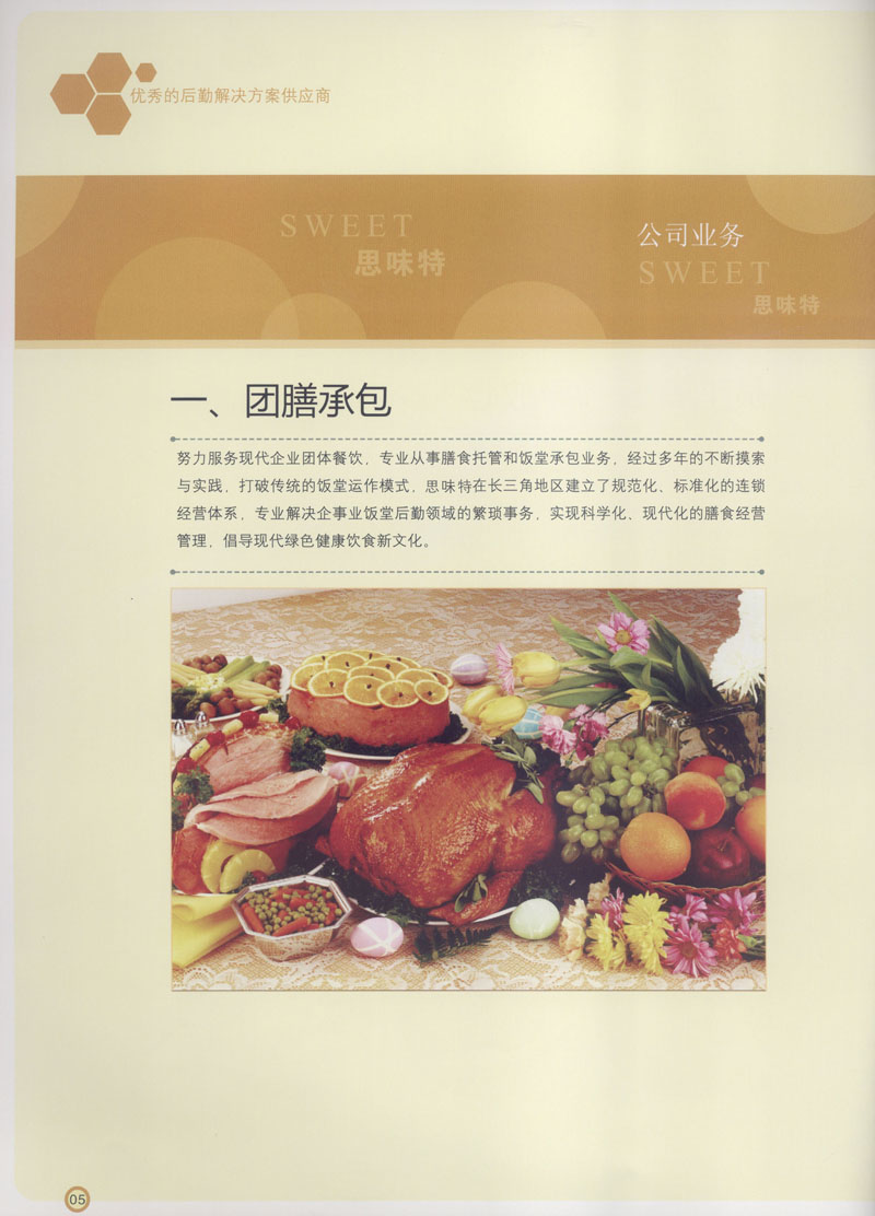 常州市思味特餐飲有限公司是一家專業(yè)從事企事業(yè)后勤服務(wù)的有限責(zé)任公司,公司從承包食堂起步,逐漸發(fā)展為經(jīng)營團(tuán)膳承包、營養(yǎng)送餐、生活區(qū)管理、連鎖餐廳的綜合型企業(yè)。2008年公司斥資100萬元,在常州興建了可以同時(shí)提供3000餐膳食的中央廚房,重點(diǎn)打造“和美客”后勤服務(wù)品牌,全力為企事業(yè)單位解決后勤后顧之憂。