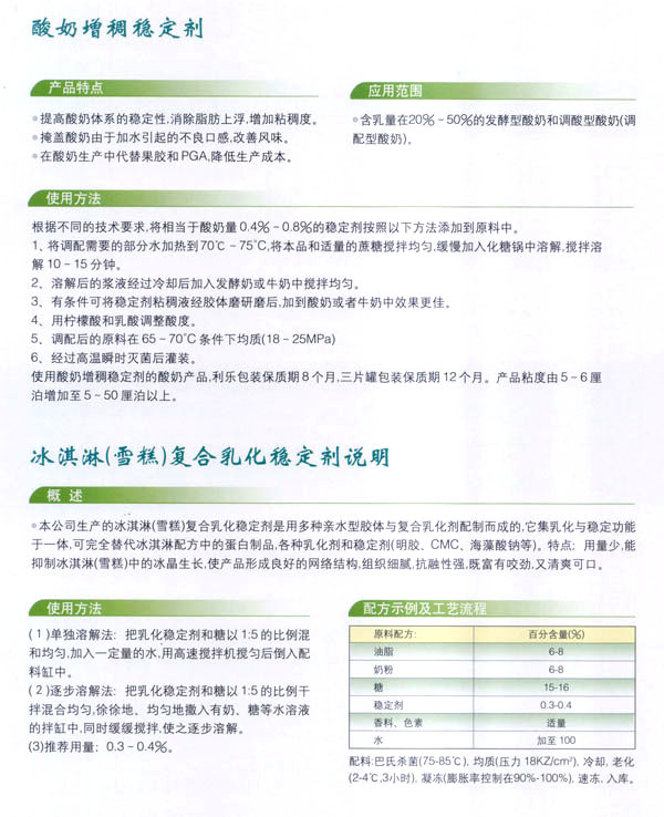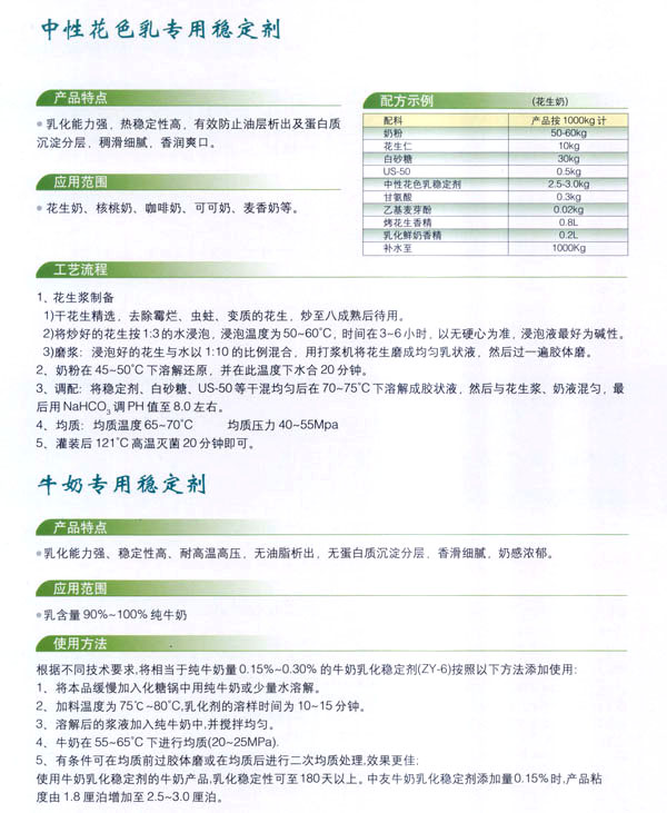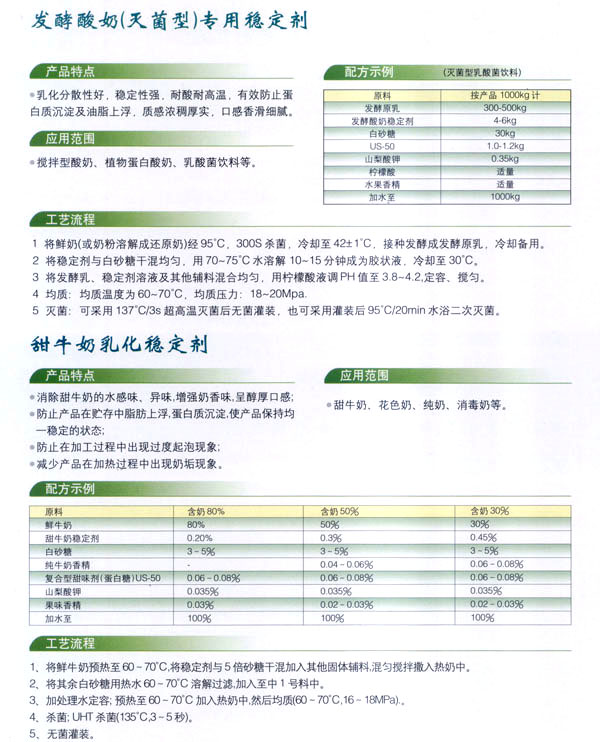 依靠本公司雄厚的科技力量和先進的科技設(shè)備,生產(chǎn)基地已經(jīng)具備了與客戶共同開發(fā)國內(nèi)外先進食品添加劑的應(yīng)用技術(shù)。博適中友公司多年來致力于食品添加劑的研究和開發(fā),突破常規(guī)理念,以市場、用戶為中心,研究開發(fā)各個品種、各個檔次的食品添加劑,品種齊全又多樣,既有出口型又有內(nèi)銷型。公司主要穩(wěn)定劑產(chǎn)品有:乳飲料乳化穩(wěn)定劑、乳酸飲料乳化穩(wěn)定劑、冰淇淋(雪糕)復(fù)合乳化穩(wěn)定劑、果汁飲料乳化穩(wěn)定劑等,產(chǎn)品暢銷國內(nèi)外,覆蓋了全國二十多個省市,并建立了穩(wěn)定的銷售網(wǎng)絡(luò)。