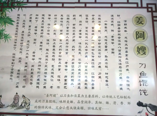 武進(jìn)高新區(qū)姜阿嫂刀魚餛飩店經(jīng)營(yíng)面積480平方米,可容納150人左右用餐,主要特色刀魚餛飩,蟹黃大湯包,榮獲“江蘇省鄉(xiāng)村美食節(jié)”金獎(jiǎng)和銀獎(jiǎng)。另外還有特色刀魚面,刀魚春卷及蟹肉餛飩,蝦肉餛飩。 本店在經(jīng)營(yíng)過(guò)程中堅(jiān)持以品質(zhì)為主,貨真價(jià)廉,貨品貴面價(jià)不貴,原料“刀魚”全是現(xiàn)場(chǎng)開片去骨。開業(yè)至今,深受廣大消費(fèi)者的好評(píng),是常州地區(qū)唯一以刀魚為特色的餐飲店。