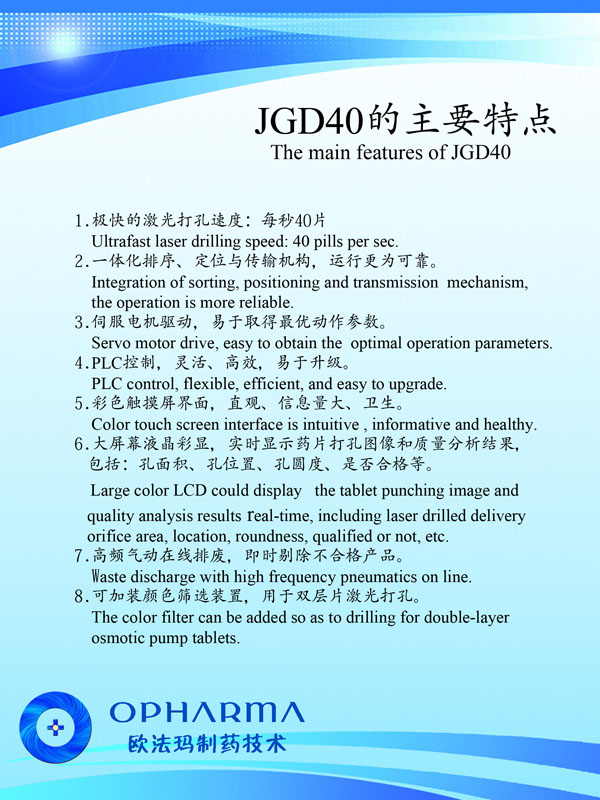 公司始建以來,以前瞻的科學(xué)規(guī)劃,通過自主研發(fā),解決了高速激光打孔機(jī)諸多的世界難題,使之達(dá)到40片/秒以上且精確打孔的國際領(lǐng)先水平;同時(shí)開發(fā)廢片自動(dòng)識(shí)別、剔除功能,以滿足客戶的實(shí)際所需。公司與瑞士等國家研究機(jī)構(gòu)的科技合作,以高速激光打孔機(jī)為基礎(chǔ),建設(shè)了滲透泵制劑研發(fā)和中試生產(chǎn)車間,開發(fā)了多種藥物的滲透泵制劑,形成了從關(guān)鍵設(shè)備研制,新制劑開發(fā)、工藝配套,到批量生產(chǎn)測試的滲透泵制劑開發(fā)全過程技術(shù)團(tuán)隊(duì)和研究設(shè)施。公司瞄準(zhǔn)現(xiàn)代新型釋藥系統(tǒng),吸收國內(nèi)外高端人才,努力開拓控緩釋技術(shù)、靶向給藥技術(shù)及智能給藥技術(shù)。