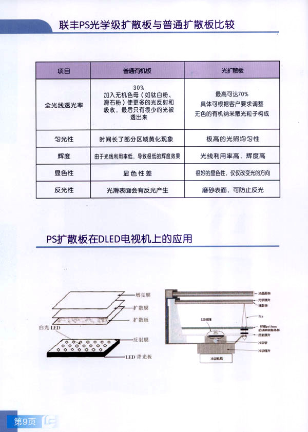 常州市聯豐(鏡面輥)集團成立于2000年,是國內從事板片材行業(yè)輥筒制造的專業(yè)企業(yè)。聯豐集團全資子公司常州市聯豐光電科技有限公司成立于2013年6月。聯豐光電專業(yè)從事光學級擴散板的研發(fā),生產和銷售。擁有各類高級技術研發(fā)人員10人,生產、管理及銷售人員60人。公司廠房占地面積2萬平方米,工廠擁有十萬級凈化車間,能有效滿足光學領域擴散板生產的環(huán)境要求。公司已經申報江蘇省高新技術企業(yè)。 公司現擁有全新進口PS專用擴散板材生產線兩條,月生產能力650噸PS擴散板。日本進口協榮裁切一體機兩臺,月加工能力50萬片(32寸擴散板)。 聯豐生產的VFP系列PS擴散板能廣泛應用于直下式LED,CCFL液晶電視背光模組。產品在很多國內一線TV的背光模組上使用。產品具有高輝度,高擴散性,特別適用于超薄背光模組的擴散部件,能有效降低成本,節(jié)約能源。 由于LED照明行業(yè)的興起,公司特別針對于LED面板燈和筒燈開發(fā)的LFP系列擴散板,在滿足透光率條件下,能最大限度提高光通量,從而增加燈具的光效,受到廣大客戶的好評。