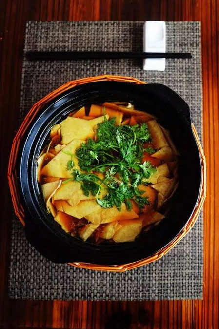 Q嫩爽滑、豆香濃郁的百葉深受老常州人的喜愛,在常州以橫山橋的最為知名。采用太湖灣農(nóng)家散養(yǎng)的土雞熬湯,雞油透亮,雞湯香醇,滿滿一鍋雞味滲透在百葉之中,美味可見一斑。這是一道跨越常州地域,卻結(jié)合常州各地物產(chǎn)的佳肴,也讓往來食客深深地感受到了太湖美,常州更美。