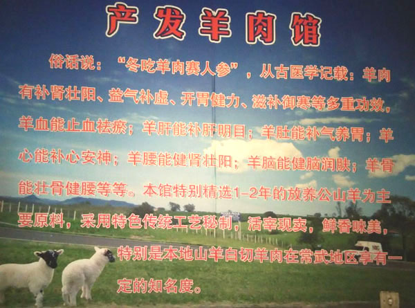 俗話說:“冬吃羊肉賽人參”,從古醫(yī)學(xué)記載:羊肉有補腎壯陽、益氣補虛、開胃健力、滋補御寒等多重功效,羊血能止血丄祛瘀;羊肝能補肝明目;羊肚能補氣養(yǎng)胃;羊心能補心安神;羊腰能健胃壯陽;羊腦能健腦潤膚;羊骨能壯骨健腰等等。本館特別精選1-2年的放養(yǎng)公山羊為主要原料,采用特色傳統(tǒng)工藝秘制,活宰現(xiàn)賣,鮮香味美,特別是本地山羊白切羊肉在常武地區(qū)享有一定的知名度。