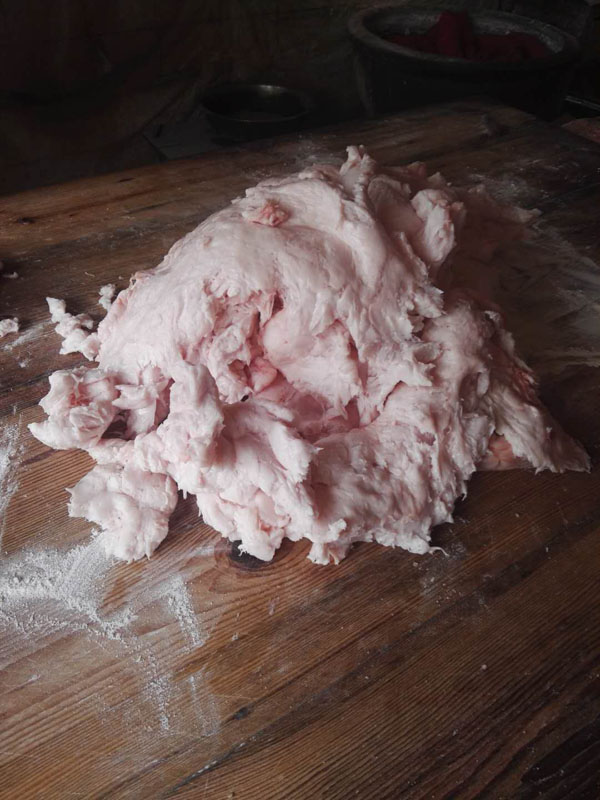 每天凌晨一兩點鐘,沈國平就要去采買當(dāng)天最新鮮的豬板油,回來清理干凈,和上面粉攪拌均勻,制成面團。麻糕的制作主要由沈國平妻子和兩個姊妹來完成。揉面、搓胚子、配油酥,按餡心、搟均勻,整個過程行云流水,連貫無比。
