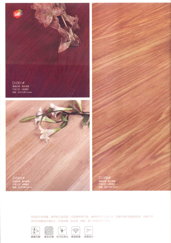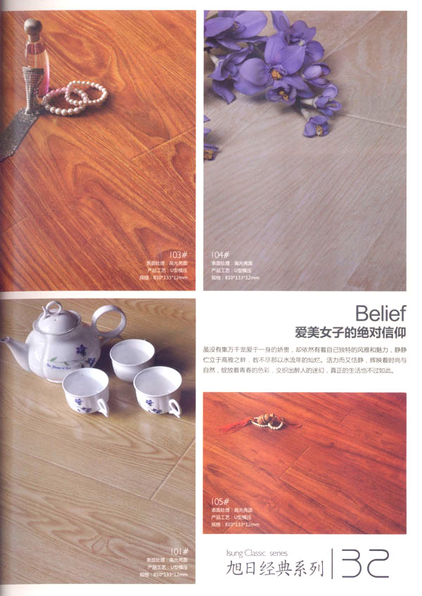 品牌保證,質量放心 公司旗下“霞光.旭日”品牌地板系列由旭日皇家、旭日經典、旭日戀家、至尊奢華、巧奪天工、水晶陶瓷等幾個系列構成,配有專職質量檢驗人員,嚴把產品質量關,不斷完善產品質量體系、監(jiān)控管理體系。公司對客戶需求全面、科學、準確地把握,確保對客戶市場適時高效反應。一流的設備、精心的選材、完美的工藝以及對產品品味不倦的追求,令奔公司產品獨樹一幟。
