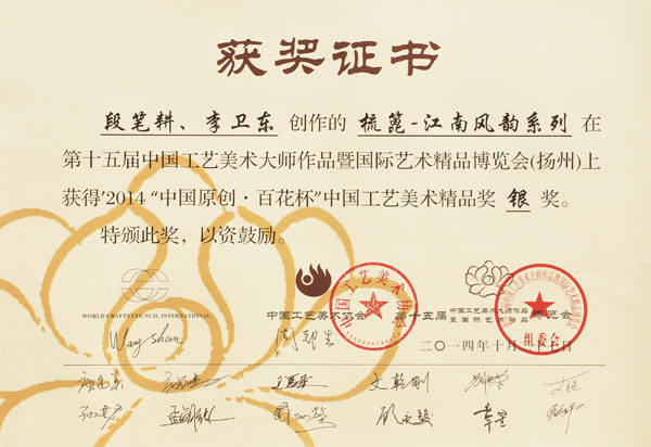2014“中國原創(chuàng)•百花杯”中國工藝美術(shù)精品大獎賽,虞美人《梳篦-江南風(fēng)韻系列》喜獲銀獎
