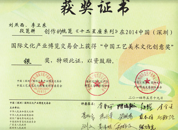2014中國(深圳)國際文化產(chǎn)業(yè)博覽交易會,劉燕西、李衛(wèi)東、段筆耕<十二星座系列>獲得“中國工藝美術(shù)文化創(chuàng)意獎”銀獎
