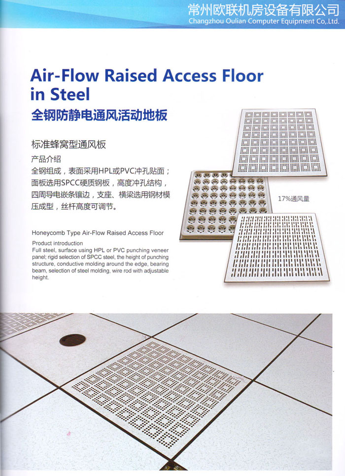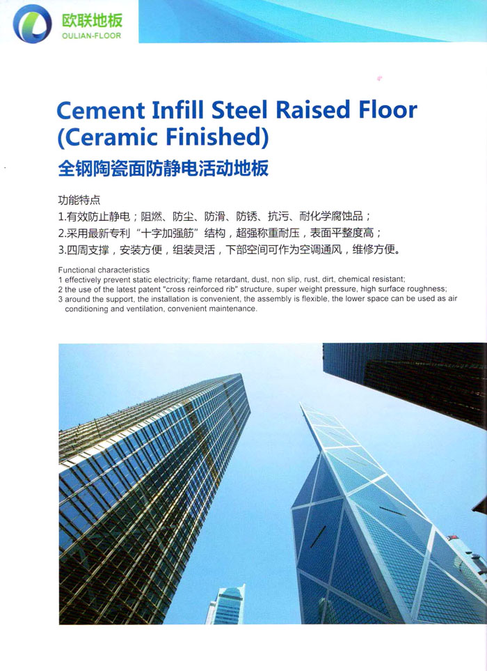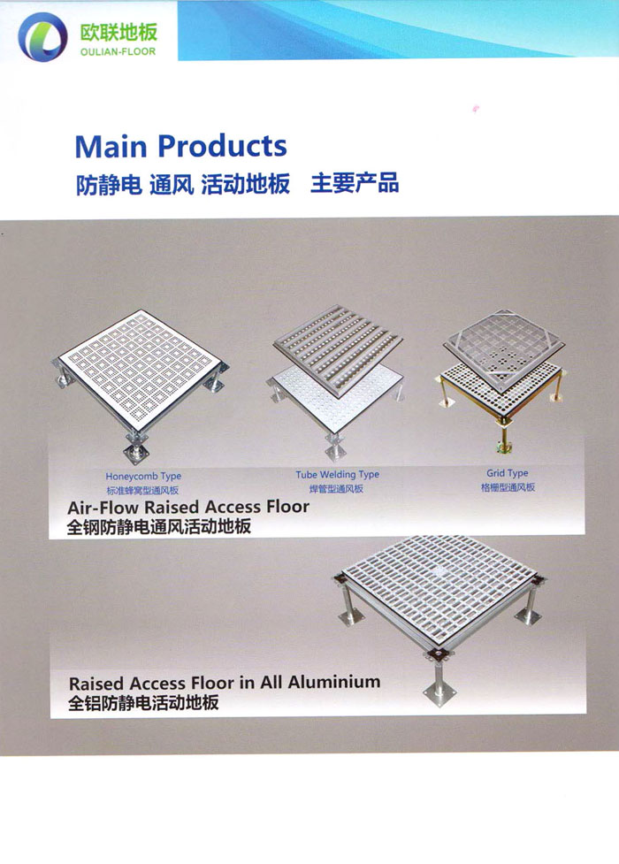 防靜電高架活動(dòng)地板、全鋼地板、陶瓷地板是計(jì)算機(jī)行業(yè)發(fā)展起來(lái)的新型鋪地材料,隔離了潮氣、靜電灰塵,最重要的是解決了綜合布線問(wèn)題,無(wú)需預(yù)埋管線,可隨時(shí)拆卸、搬移,保證了資訊設(shè)備完整的優(yōu)點(diǎn),適應(yīng)了智能化樓宇中信息自動(dòng)化技術(shù)對(duì)所處環(huán)境的特定要求,避免了廣大客戶的雙重投資,使現(xiàn)代化辦公程度更加高效,辦公場(chǎng)所更加舒適。 “歐聯(lián)”系列全鋼地板,符合國(guó)家安全要求,種類完備多樣,其中防靜電陶瓷地板、硫酸鈣地板等除具有普通瓷質(zhì)的裝飾和實(shí)用性外,其耐磨、防水、防火功能優(yōu)于其它同類產(chǎn)品,防靜電系列地板,能切合不同客戶的要求,其靈活的配置,深受客戶歡迎,不同材質(zhì)的地板結(jié)構(gòu)使設(shè)計(jì)師的設(shè)計(jì)空間比傳統(tǒng)的更加廣闊自由和善變。 公司大力發(fā)展國(guó)內(nèi)外銷售業(yè)務(wù),多次中標(biāo)國(guó)內(nèi)重點(diǎn)工程 ,例:哈爾濱醫(yī)科大學(xué)、山東大學(xué)、上海普通機(jī)場(chǎng)等。 公司將一如既往開發(fā)和制造一流的產(chǎn)品,愿與廣大有識(shí)之士合作發(fā)展,共創(chuàng)美好未來(lái)。