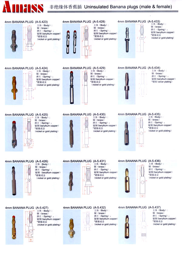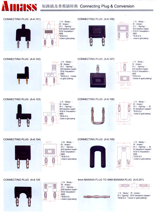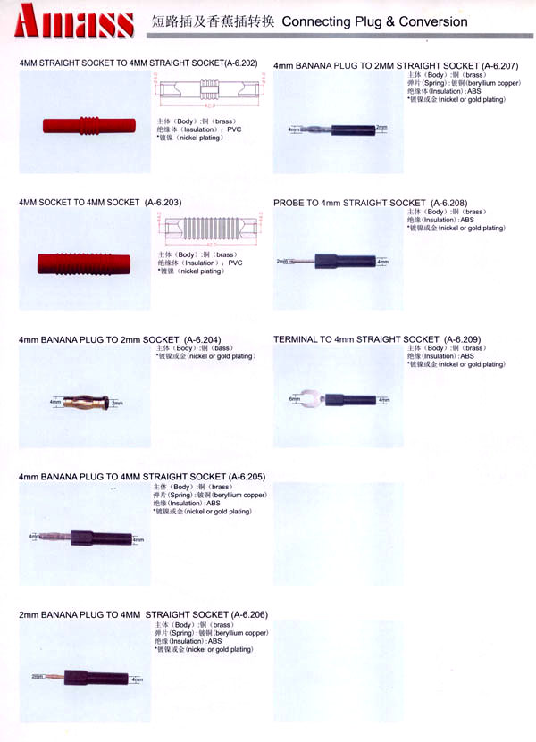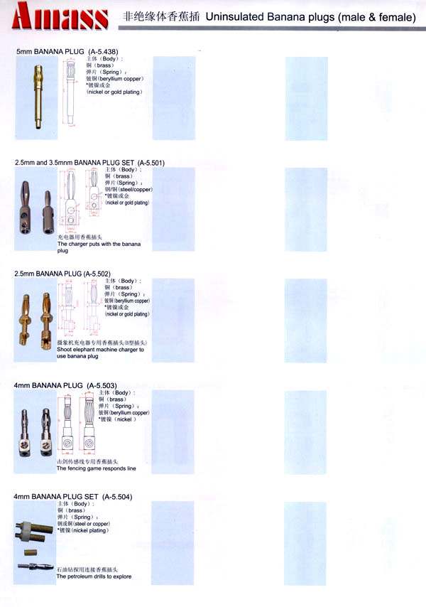 本公司專業(yè)生產(chǎn)各類香蕉插頭,香蕉插座,接線柱,電瓶夾,鱷魚夾,測試導(dǎo)線,測試筆等。產(chǎn)品分2mm/2.5mm/3mm/3.5mm/4mm五大系列,百余種款式, 各種香蕉插廣泛用于儀器、儀表、電力測試、教學(xué)、玩具,視聽設(shè)備、醫(yī)療儀器,保健產(chǎn)品等領(lǐng)域。公司技術(shù)力量雄厚,生產(chǎn)工藝先進(jìn),產(chǎn)品遠(yuǎn)銷港、臺、歐美,并與飛利浦等國際品牌配套。公司本著精益求精的理念,歡迎新老客戶光臨。 我們擁有資深的工程師和豐富的電子產(chǎn)品銷售經(jīng)驗,專業(yè)生產(chǎn)各類電子接插件產(chǎn)品。 香蕉插頭,香蕉插座,電瓶夾,鱷魚夾等品種齊全、 質(zhì)量可靠,致力服務(wù)于通訊、數(shù)據(jù)通信、消費類電子產(chǎn)品、計算機(jī)和計算機(jī)外圍設(shè)備以及工業(yè)應(yīng)用等領(lǐng)域,能給客戶提供全面采購解決方案。 我們秉承穩(wěn)健作風(fēng)、誠實經(jīng)營、合理價格、完善服務(wù)的宗旨,在全體客戶的支持下,公司不斷創(chuàng)新進(jìn)取,業(yè)績蒸蒸日上,已與數(shù)十家電子零件制造商及其分支機(jī)構(gòu)建立密切合作關(guān)系,在國內(nèi)擁有數(shù)百家固定客戶。