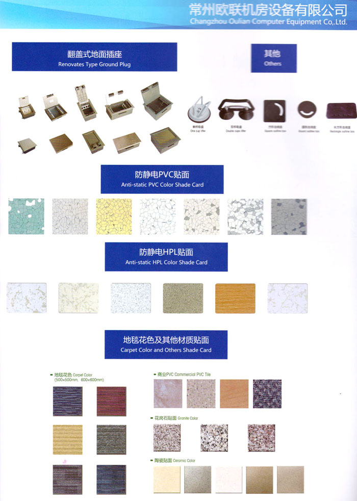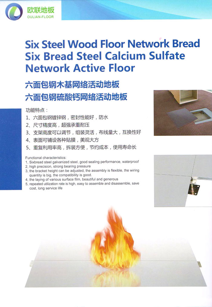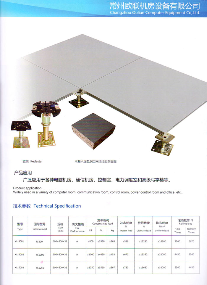 防靜電高架活動(dòng)地板、全鋼地板、陶瓷地板是計(jì)算機(jī)行業(yè)發(fā)展起來的新型鋪地材料,隔離了潮氣、靜電灰塵,最重要的是解決了綜合布線問題,無需預(yù)埋管線,可隨時(shí)拆卸、搬移,保證了資訊設(shè)備完整的優(yōu)點(diǎn),適應(yīng)了智能化樓宇中信息自動(dòng)化技術(shù)對(duì)所處環(huán)境的特定要求,避免了廣大客戶的雙重投資,使現(xiàn)代化辦公程度更加高效,辦公場(chǎng)所更加舒適。 “歐聯(lián)”系列全鋼地板,符合國(guó)家安全要求,種類完備多樣,其中防靜電陶瓷地板、硫酸鈣地板等除具有普通瓷質(zhì)的裝飾和實(shí)用性外,其耐磨、防水、防火功能優(yōu)于其它同類產(chǎn)品,防靜電系列地板,能切合不同客戶的要求,其靈活的配置,深受客戶歡迎,不同材質(zhì)的地板結(jié)構(gòu)使設(shè)計(jì)師的設(shè)計(jì)空間比傳統(tǒng)的更加廣闊自由和善變。 公司大力發(fā)展國(guó)內(nèi)外銷售業(yè)務(wù),多次中標(biāo)國(guó)內(nèi)重點(diǎn)工程 ,例:哈爾濱醫(yī)科大學(xué)、山東大學(xué)、上海普通機(jī)場(chǎng)等。 公司將一如既往開發(fā)和制造一流的產(chǎn)品,愿與廣大有識(shí)之士合作發(fā)展,共創(chuàng)美好未來。