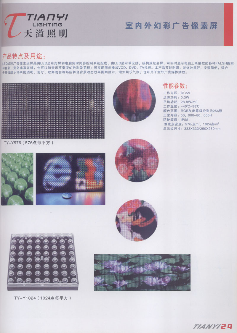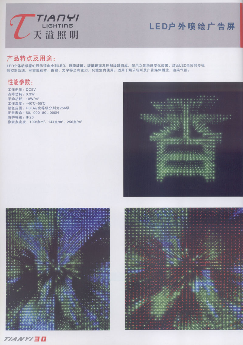 天溢照明是中國(guó)領(lǐng)先的專業(yè)從事LED廣告照明裝飾燈具設(shè)計(jì)、系統(tǒng)開(kāi)發(fā)、燈具制造、工程服務(wù)一體的專業(yè)型公司,本公司產(chǎn)品已廣泛應(yīng)用于全國(guó)大多數(shù)城市夜景亮化景觀照明、酒店休閑娛樂(lè)夜場(chǎng)夢(mèng)幻燈光、戶內(nèi)外廣告宣傳、建筑及室內(nèi)照明以及家居裝飾等場(chǎng)合。