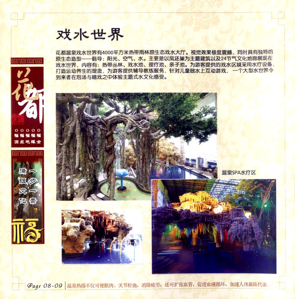 淹城花都溫泉水城孕育天地之精華,悅身、悅?cè)、悅心、悅神。置身其中泉水潺潺,霧氣繚繞、花瓣飄香,恍若仙境!稗渌略谑,弄花香滿衣”,花都溫泉的浪漫與溫潤(rùn)在這里完美展現(xiàn)。 花都溫泉水城包括洗浴區(qū)、戲水世界、露天溫泉、自助餐廳、生態(tài)房、別墅區(qū)、紅文化房、VIP區(qū)等多種功能區(qū)域,是集溫泉養(yǎng)生、休閑住宿、演藝會(huì)務(wù)為—體的休閑度假勝地,給賓客帶來(lái)江南小鎮(zhèn)的浪漫水城之旅。 古木新枝畔賓客對(duì)酒當(dāng)歌,溪泉石椅旁把茶品啜。 淹城-三勤生態(tài)酒店,這里是一處綠色生態(tài)的美食家園。此地鬼斧神工.奇水異石,和風(fēng)細(xì)雨林中穿過(guò),引百鳥(niǎo)朝來(lái)暮歌;這里集生態(tài)餐飲、演藝、中小型會(huì)務(wù)為一體,將現(xiàn)代裝飾風(fēng)格和古雅拙樸的自然裝修完美整合;這里聚集大江南北名廚,推出精致綠色美昧佳肴。來(lái)到這里,賓客可享田園至美之景,品舌尖至鮮之味,實(shí)乃人生一大樂(lè)事。